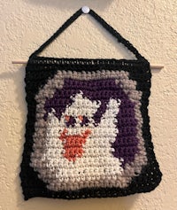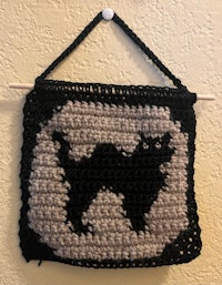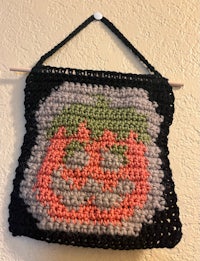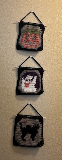 halloween themed hanging tapestries made with cotton and acrylic yarns.